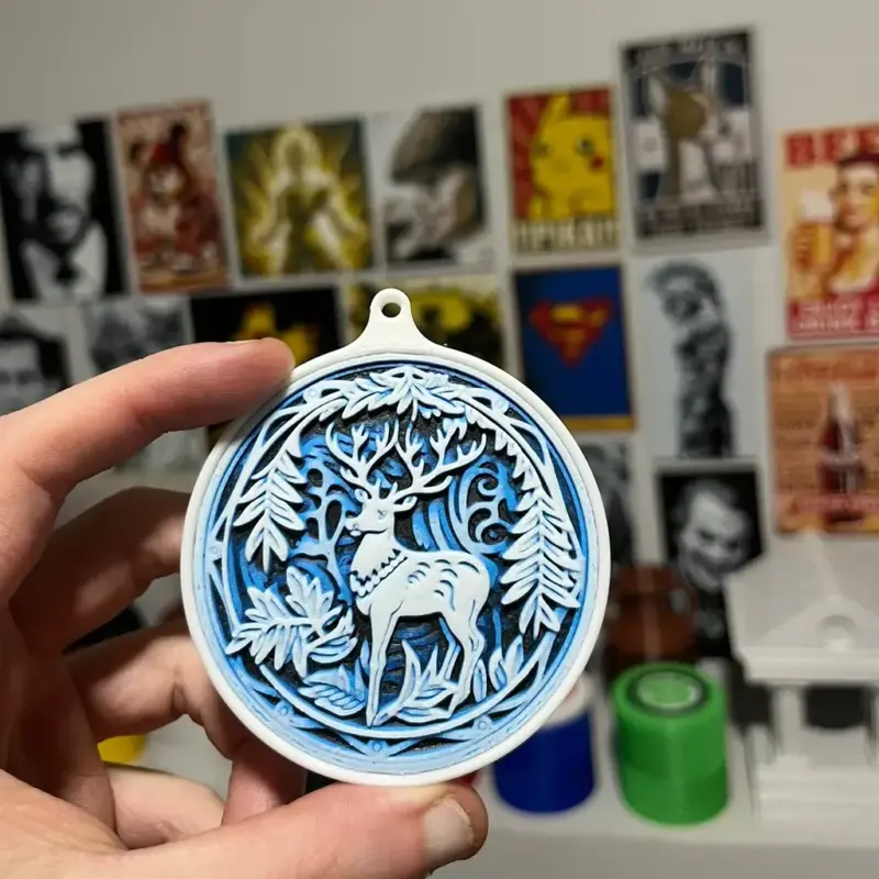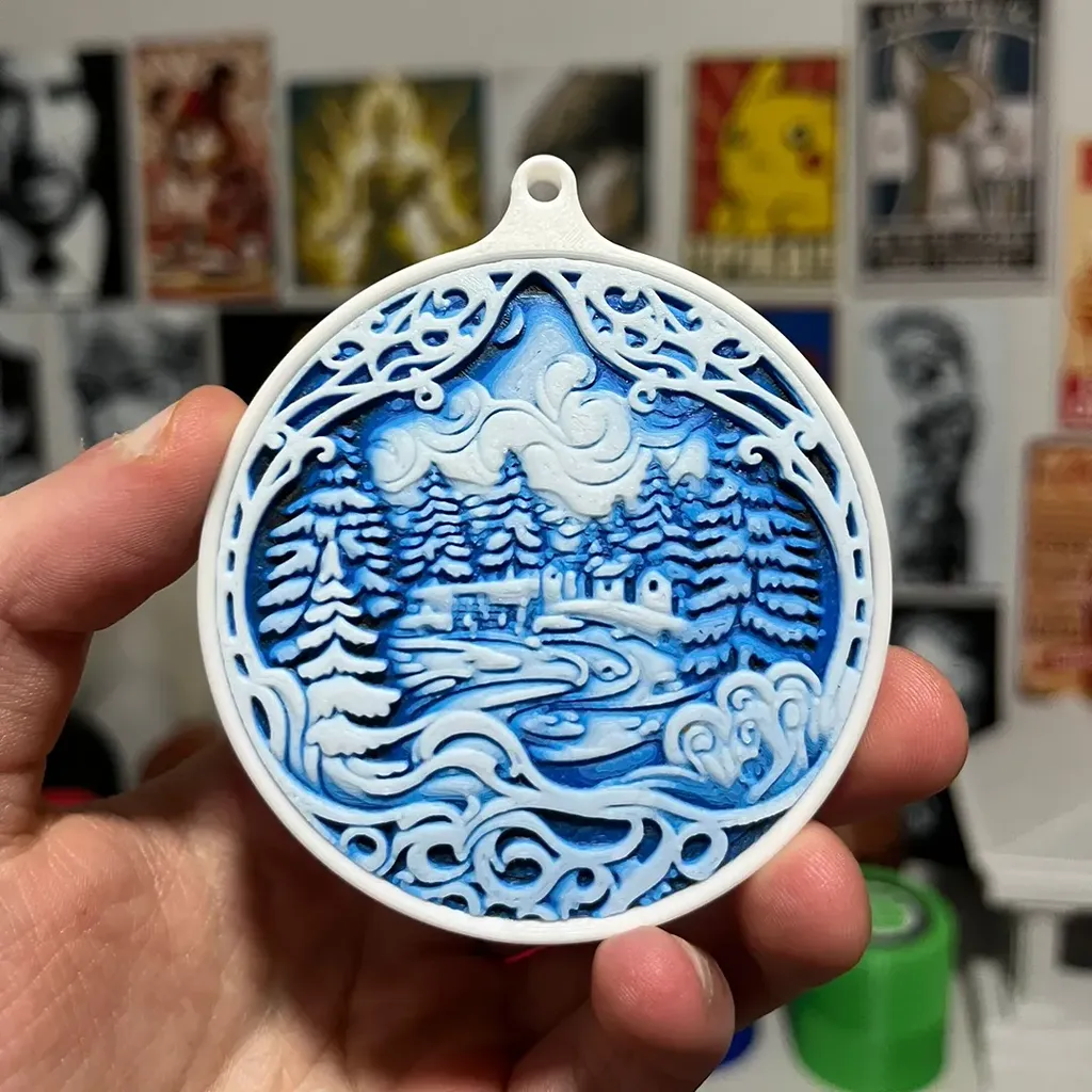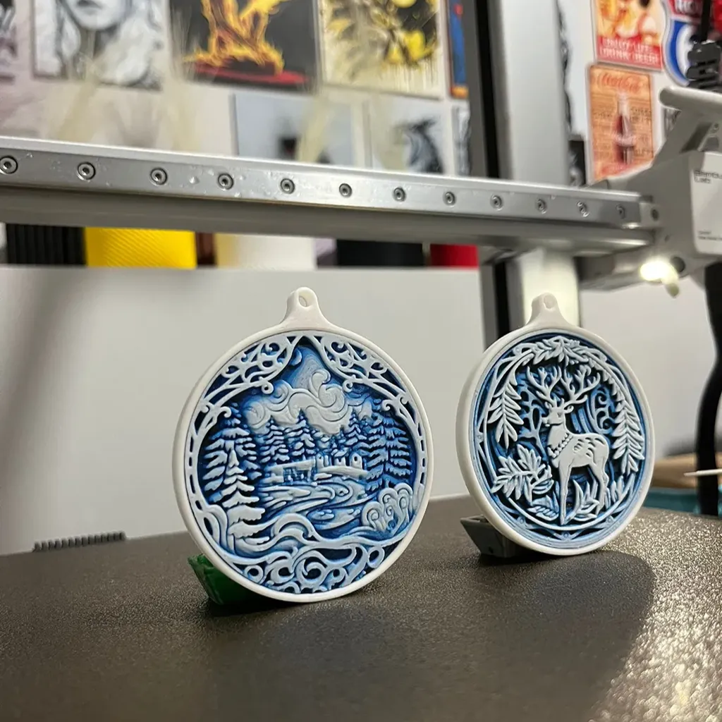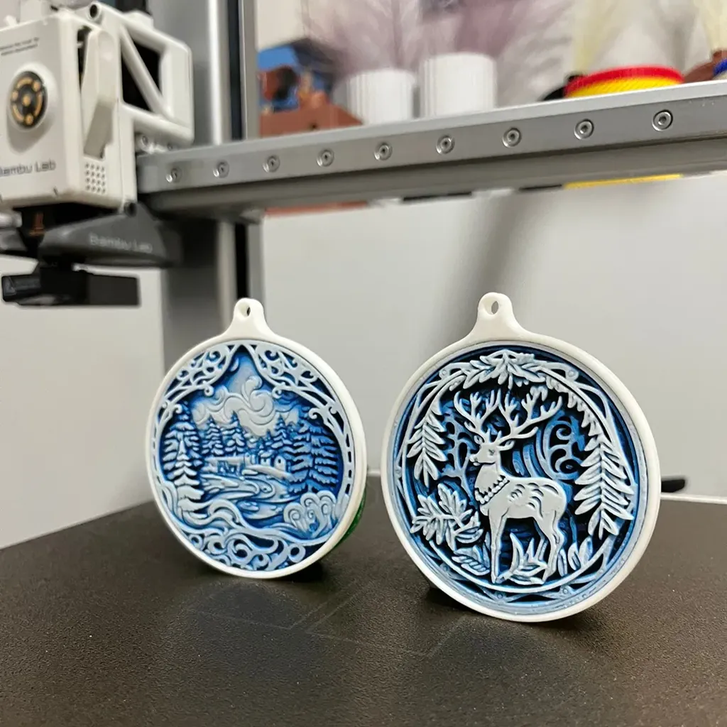 Add a touch of winter wonderland charm to your holiday decor with this set of two intricately designed deer and scenery ornaments. Beautifully crafted with a scenic blue and white design, these ornaments will bring festive cheer to your tree. Perfect for adding a unique, handcrafted touch to your seasonal celebrations.